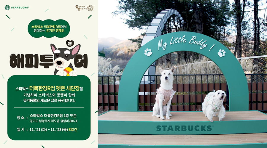 스타벅스는 리뉴얼 오픈에 맞춰 동물보호단체 ‘동물과 함께 행복한 세상’과 손잡고 더북한강R점에서 유기동물 입양 캠페인을 비롯한 다채로운 프로그램을 선보인다.