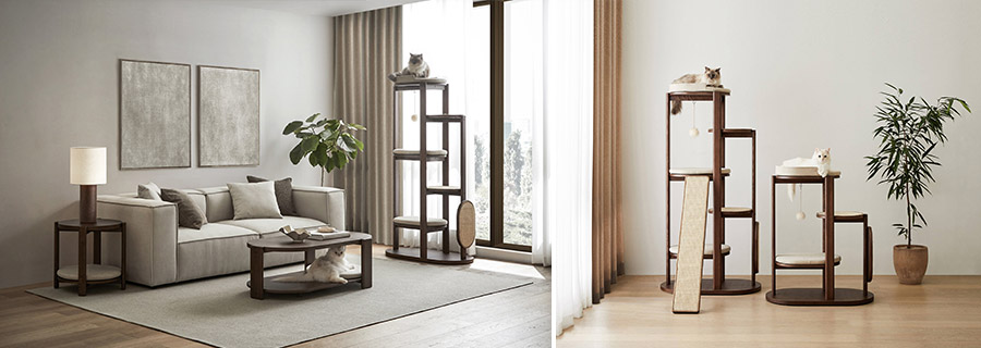 캣타워는 간결한 형태와 세련된 색감, 애쉬(물푸레나무) 원목 소재가 주는 고급스러운 디자인이 돋보이는 제품이다. 애쉬 원목은 묵직하고 견고하면서도 특유의 결이 아름다우며 가격대가 높은 소재로 잘 알려져 있다. 각 층마다 소파와 동일한 기능성 원단을 사용한 쿠션과 *사이잘삼ᆞ황마 등 천연소재를 사용한 *스크래쳐도 장착했다. 탈부착이 가능해 세탁과 교체가 쉽다. 다기능 고리를 설치해 고양이 장난감을 달아 놓거나 스크래쳐 역할을 하는 삼줄을 고정시키기에도 편리하다.