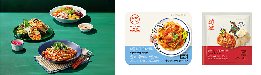 신세계푸드는 ‘유아왓유잇’ 코엑스점의 인기 메뉴를 집에서 손쉽게 즐길 수 있도록 식물성 간편식(PMR, Plant-based HMR)도 추가 개발해 선보였다. 지난해 9월 첫 선을 보인 ‘유아왓유잇’ 식물성 간편식 ‘런천 김치덮밥’, ‘볼로네제 라자냐’, ‘라구 리가토니’ 등은 전자레인지로 데우기만 하면 바로 먹을 수 있는 RTH(Ready to Heat) 방식의 원밀(One-meal)형 제품으로 호응을 얻었다. 이에 신세계푸드는 소비자들이 다양한 메뉴를 선택할 수 있도록 ‘볼로네제 라이스 브리또’, ‘나폴리탄 스파게티’ 2종도 새롭게 출시했다. ‘볼로네제 라이스 브리또’는 얇고 쫄깃한 또띠아 피 속에 자체 기술로 개발한 식물성 볼로네제 소스에 밥, 병아리콩, 베이크드 빈스를 넣어 전통 멕시칸 음식의 맛을 구현했다. ‘나폴리탄 스파게티’는 담백한 식물성 후랑크에 새콤달콤한 맛의 나폴리탄 소스를 넣어 누구나 부담 없이 즐길 수 있도록 했다. 두 제품 모두 100% 식물성 재료로 만들었다.