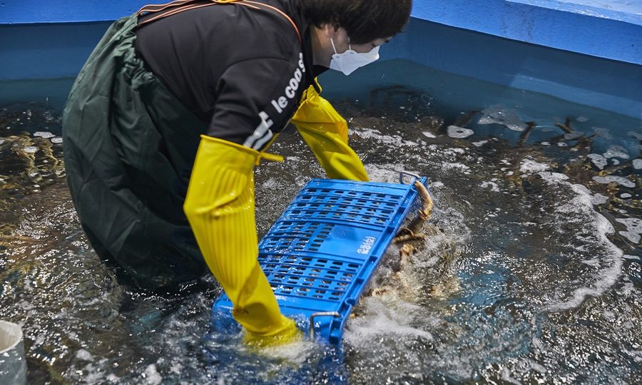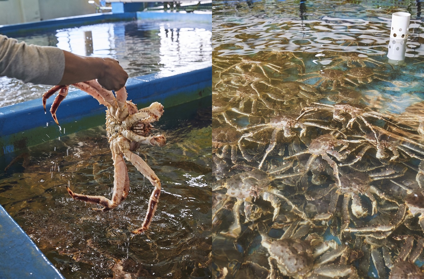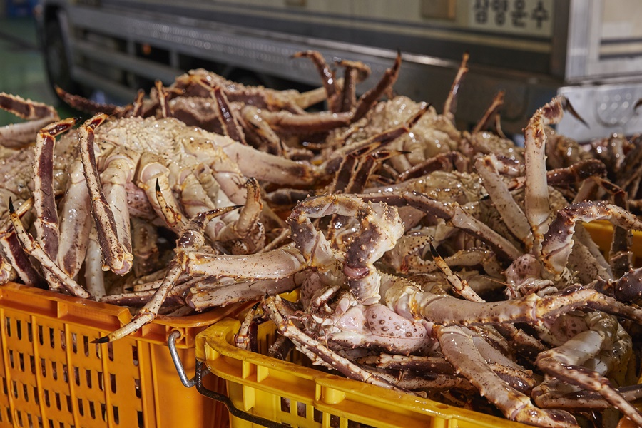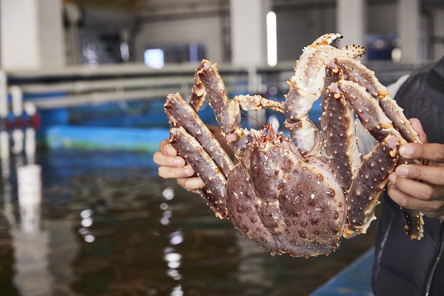 긴 여정을 마친 녀석들이지만 생기만큼은 가득하다. 조업선 내부에는 서식 환경과 유사한 수조를 만들어 옮기고, 도착한 속초 보세 창고에서는 산소와 해수 공급 등 국내 최고 수준의 축양 시설로 킹크랩을 지킨다. 레드 킹크랩 수입 관계자는 “육지에서 5Km가량 떨어진 바다 근처의 물을 가져온다. 특히, 수심 510m에서 끌어올린 청정한 해양심층수(2°C~3°C)를 수조에 그대로 공급한다. 그 때문에 불순물이 적고 미네랄이 풍부하다. 킹크랩이 건강하게 생존할 수 있는 최적화된 환경이다.” 고 밝혔다.