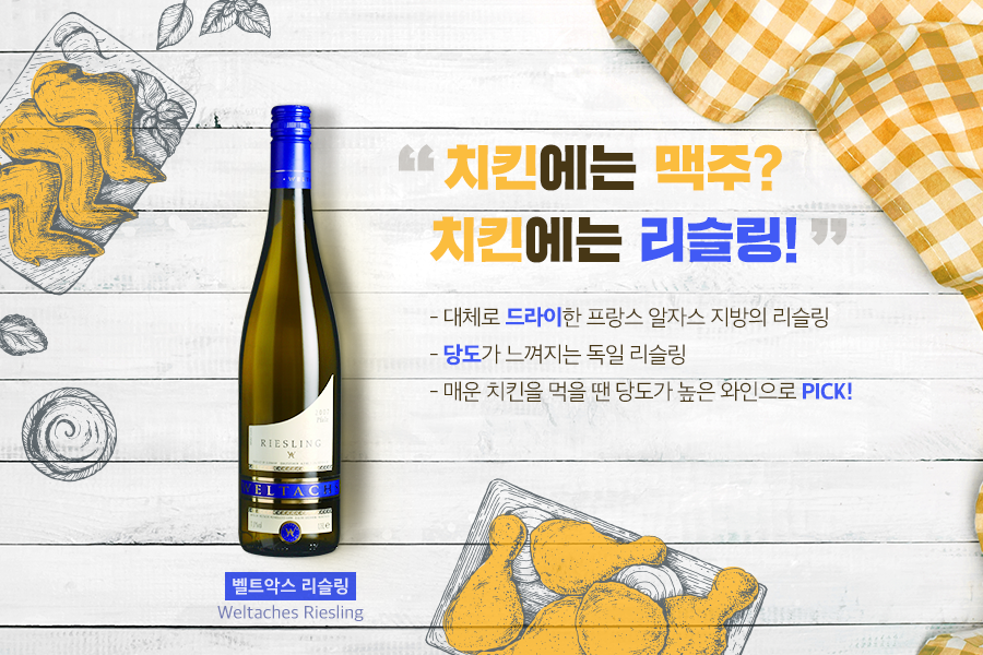 치맥(치킨엔 맥주)이 익숙하셨겠지만, 오늘부터는 치리(치킨엔 리슬링)라고 불러보세요. 프라이드 양념, 매운맛, 허니 등등 치킨의 무한 변주를 모두 커버할 와인으로는, 리슬링이 딱이랍니다.