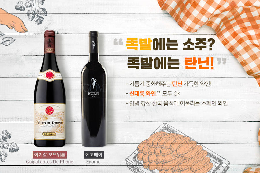 이제 기름기를 중화시켜주는 탄닌 그득한 와인을 제안합니다. 일단 대부분의 신대륙 와인은 모두 어울립니다. 프랑스 론 지역의 꼬뜨뒤론 와인도 정말 잘 어울리죠. 게다가 가격도 높지 않아 부담 없습니다.