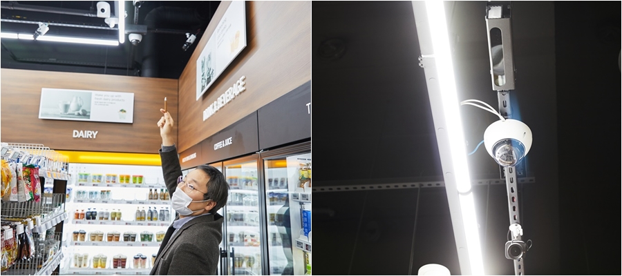 신재규 팀장은 “30여 대의 카메라(컴퓨터 비전 기술)와 무게 측정 센서가 내장된 매대(로드셀)로 크로스 체크를 한다. 그럼에도 발생할 수 있는 오류들마저 딥러닝(Deep Learning) 기반의 AI가 지속 개선한다.” 라고 말한다. 이야기를 듣고 천장을 올려다보니, 미처 눈치채지 못했던 수많은 카메라가 보인다. 카메라는 크게 두 종류로 나뉜다. 사각 형태의 검정색 카메라는 고객의 동선과 모션을 인식하고, 나머지 카메라들은 고객이 어떤 물건을 들었는지 인식한다. 이에 관련해 신재규 팀장은 “아마존고에 가면 천장에 카메라가 가득하다. 반면, 셀프서비스 스토어는 단 31개의 비전 카메라와 850개의 로드셀로 같은 기능을 해낸다.” 라며 매장 효율 측면을 자신했다.