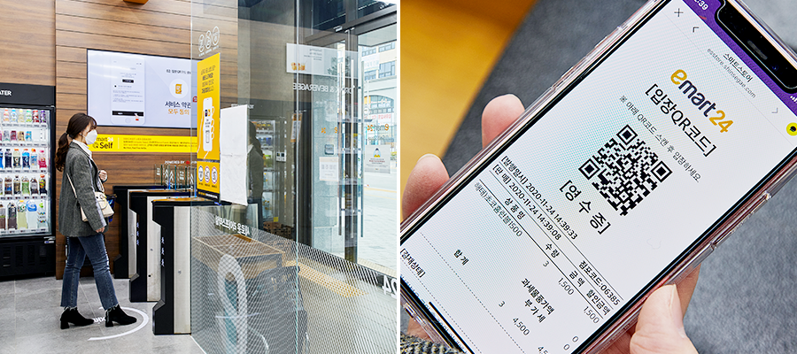 들어서자 일반 이마트24와의 차이가 눈에 띈다. 사람 대신 고객을 맞는 것은 출입구와 키오스크다. 2.0 진화의 핵심은 출입 방식에 있다. 셀프 서비스 스토어 1.0은 편의성 및 결제 정확도에서 높은 만족도를 보였다. 그러나 ‘필수 앱 설치’와 ‘14세 미만 입장 불가’는 한계로 분석됐다. 신세계아이앤씨 스마트리테일팀의 신재규 팀장은, “지속적인 모니터링을 통해 알 수 있었다. 앱 설치 때문에 다시 나가거나, 부모님과 함께 왔다가 같이 못 들어가는 아이도 있었다. 방식을 개선해야 할 필요성을 느꼈다” 라고 말했다.