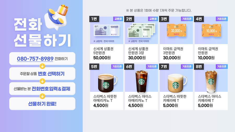 현재는 신세계 상품권과 스타벅스 기프티콘 등 10여 개의 상품을 전화로 선물할 수 있으며, 향후 판매 상황과 고객 반응에 따라 품목을 더 확대해 나갈 계획이다.
