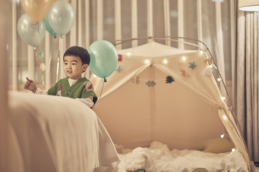 주니어 스위트 타입 이상 예약 고객에게는 프랑스 키즈 코스메틱 브랜드 ‘네일매틱 키즈’의 배스 솔트와 배스 밤을 선물해 아이의 정서 안정과 감각 발달에 도움이 되는 힐링 데이를 선사할 예정이다. 배스 솔트와 배스 밤 세트는 ‘Safe, Fun, Creative’라는 브랜드 슬로건에 걸맞게 자연 유래 원료로 만들어져 건강함과 더불어 목욕 놀이의 즐거움까지 만끽할 수 있다. 조선호텔에서 자체 제작한 ‘베이비 배스 로브’도 선물로 함께 구성해 투숙 후 집에서도 활용하며 호텔에서의 경험을 좋은 추억으로 남길 수 있도록 했다. 이외에도 우리 아이만을 위한 프라이빗한 플레이 공간인 키즈 플레이 텐트가 객실 내 비치되어 도심을 벗어나지 않고도 글램핑을 하는듯한 이색적인 경험을 제공할 예정이다.
