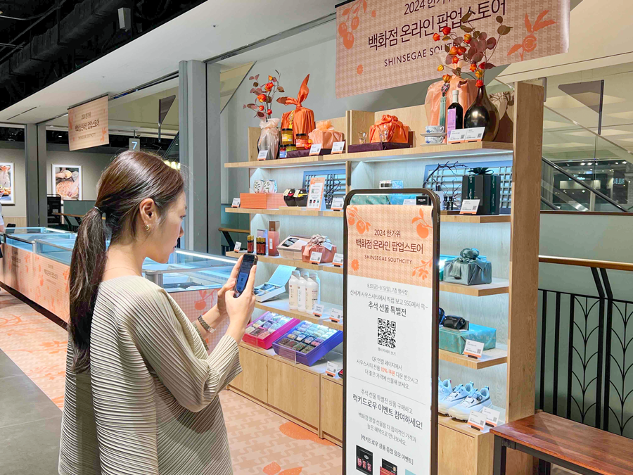 사우스시티 7층과 김해점 1층 명절 행사장에서 QR코드를 스캔하면 터치 한 번으로 최대 20명에게 한번에 선물할 수 있는 SSG닷컴 신세계백화점몰 ‘한가위 선물 추천’ 페이지로 연결된다. 수신인 연락처만 입력해 선물을 주문하면 받는 사람이 직접 배송지를 입력, 읍·면 단위까지 전국 어디서든 배송받을 수 있다.