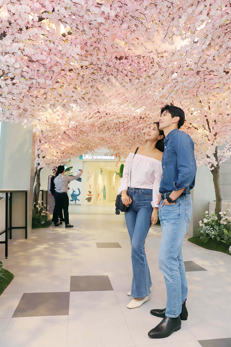 4월 한 달간 경기점 지하 1층과 지상 6층 연결통로에서 만나볼 수 있는 실내 벚꽃 길은 길이 15m, 높이 7m로 미세먼지 없는 실내에서 봄 분위기를 만끽할 수 있도록 연출했다.