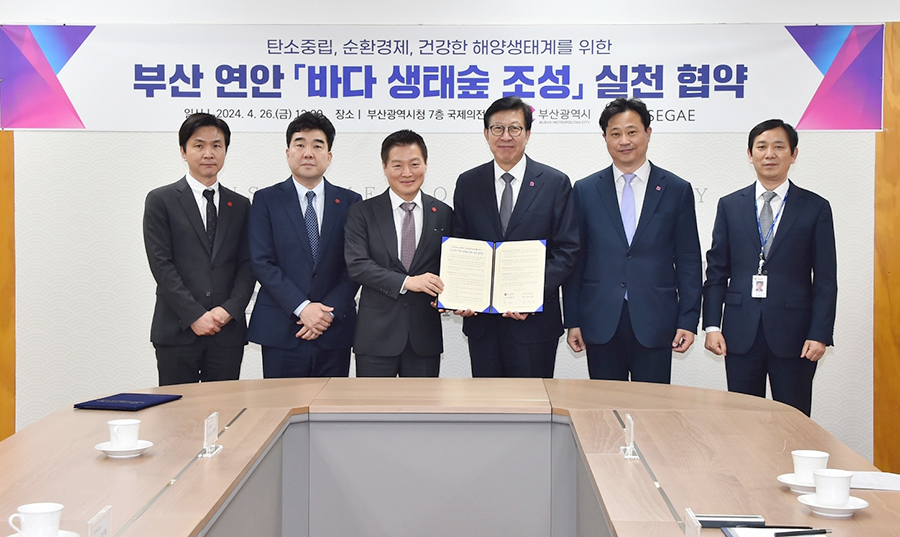 신세계는 이달 26일 부산시청 국제의전실에서 부산광역시와 부산연안 ‘바다 생태숲 조성’ 실천 협약을 체결했다.