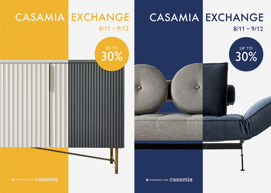 신세계까사는 오랜 시간 까사미아와 함께한 고객의 사랑에 보답하는 의미로 기존 고객이 새 까사미아 가구를 최대 30% 할인가에 구매할 수 있는 ‘까사미아 익스체인지(CASAMIA EXCHANGE)’ 이벤트를 진행한다.