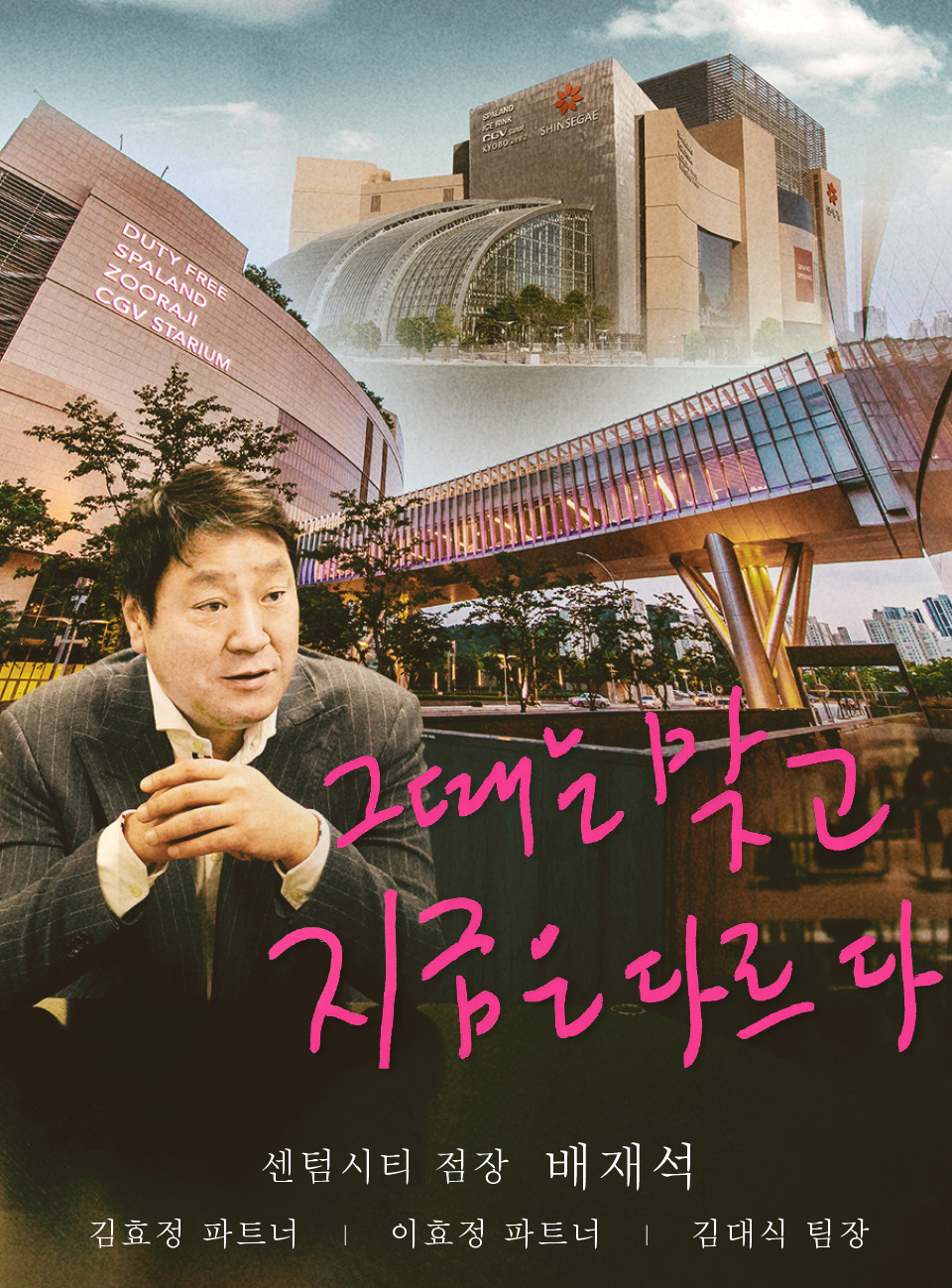 “안녕하세요. 센텀시티 점장 배재석입니다. 2009년 3월, 부산에 글로벌 랜드마크가 생겼습니다. 신세계 센텀시티는 세계 최대 규모의 백화점으로 기네스 월드 레코드에 올랐다는 곳으로만 주목받고 있는 것은 아닙니다.”