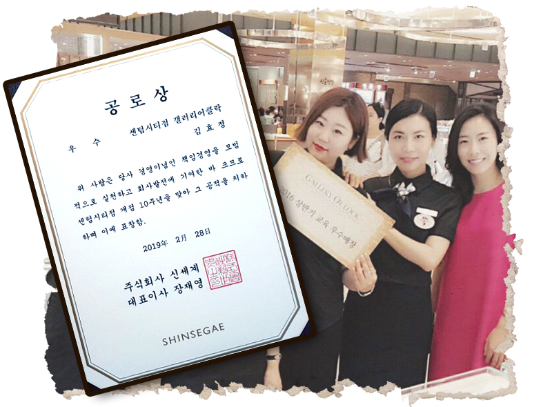 신세계 센텀시티 오픈 때부터 지금까지 근무중입니다. 얼마 전에 10주년 공로상도 받았죠. 이젠 일터를 넘어 삶터에요! 뻔한 말처럼 들리겠지만 저희 협력업체 직원들과 신세계 센텀시티 파트너들의 사이는 정말 가족같아요. 서로 배려하면서 좋은 관계를 유지하고 있어요. 이 자체로 자부심이 느껴질 정도에요.