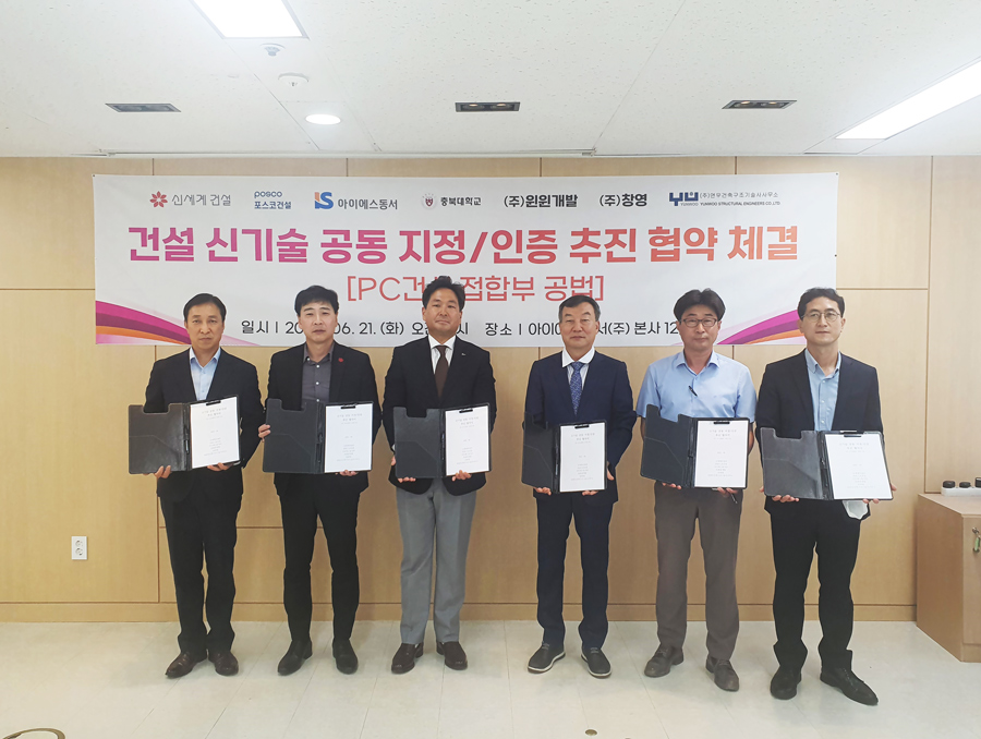 신세계건설은 ㈜포스코건설, 아이에스동서㈜, ㈜윈윈개발, ㈜창영, ㈜연우건축구조기술사무소와 함께 “PC 건식접합부 공법 신기술 공동추진 협약 (MOU)”을 체결하였다고 21일 밝혔다.