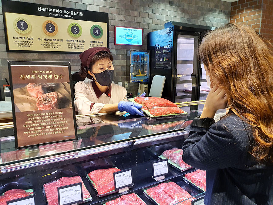 신세계백화점이 백화점 업계 최초로 직접 한우 직경매에 나서며 고품질의 소고기를 선보이고 있다. 신세계가 직접 책임지고 소개하는 제품이라 고객들이 믿고 구매한다는 평가다.
