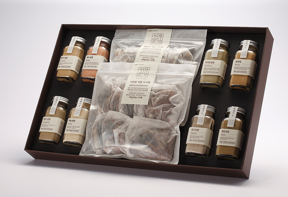 또 멸치, 새우, 다시마, 표고의 4가지 분말과 깔끔한 맛이 일품인 멸치 해물 다시팩 10개로 구성된 ‘천연조미료 세트(소)’도 5만9천원에 선보여 소규모 가정 및 싱글족들의 눈길을 모을 예정이다.유기 된장과 잔멸치 볶음고추장으로 이뤄진 전통장 2개와 국물용 티백 20개를 혼합 구성해 활용도가 높은 ‘천연조미료, 장 혼합 세트’도 5만원에 내놓았다.