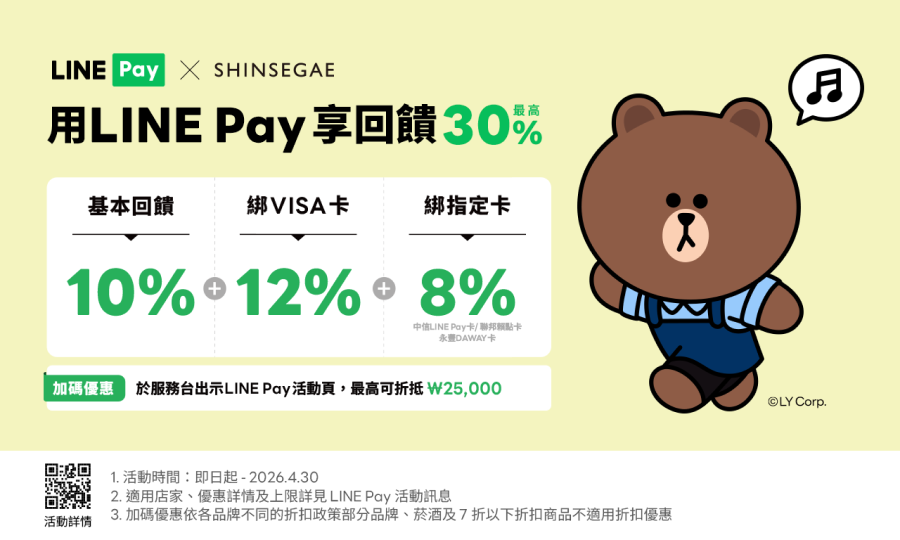 이번 프로모션은 결제 금액의 10%를 기본 적립해주고, 비자(VISA) 카드로 결제할 경우 추가로 12%를 더 적립해준다. 여기에 지정 카드인 CTBC Line Pay 카드, UBOT Lai Dian 카드, SinoPac DAWAY 카드로 결제 시 8%가 추가 적립돼 최대 30%까지 혜택을 받을 수 있다.