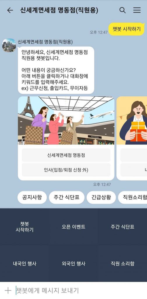 새로운 챗봇 시스템을 접한 명동점 협력사원들은 “업무와 관련되어 종합적인 정보가 모두 담겨 빠르고 손쉽게 궁금한 사항을 확인할 수 있어 앞으로 많은 도움이 될 것 같다”, “직원 소리함 이용과 지점 내 각종 입점 브랜드와 시설 위치, 식단표 확인도 가능해서 좋다.” 등 긍정적인 반응을 보였다.