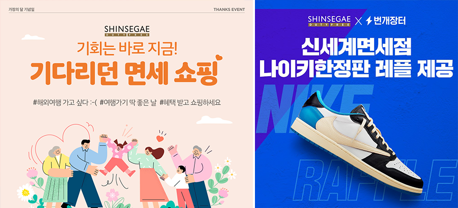 이번 레플 이벤트는 번개장터와 함께 진행하며 5월 9일부터 15일까지 응모할 수 있다. ‘조던1X트래비스 스캇X프라그먼트 레트로 로우’를 포함한 총 7종의 한정판 나이키 스니커즈가 각 2족씩 준비되어 있다. 총 14명의 당첨자를 추첨해 한정판 스니커즈를 경품으로 제공한다. 신세계면세점 온라인몰 내국인 회원 및 번개장터 회원을 대상으로 하며 당첨자는 5월 말 발표할 예정이다.