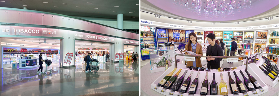 면세점에서 선물용으로 수요가 높은 듀어스, 로얄 살루트, 헤네시 등과 중국술로 인기가 높은 마오타이, 우량예, 양허, 수정방 등이 마련됐다. 일부 상품들은 50ml 용량의 미니어처부터 550ml까지 다양하게 만날 수 있다.