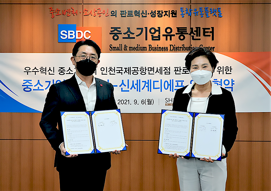신세계면세점은 인천공항 내 중소기업 제품 전용 면세점 운영 활성화를 지원하기 위해 지난 6일 중소기업유통센터와 업무협약을 맺었다.