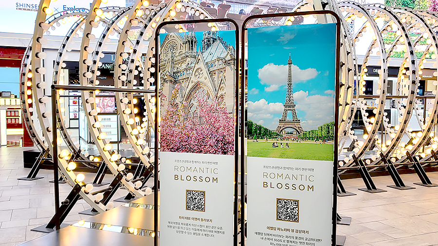 먼저, 신세계면세점 명동점 10층 대형 미디어파사드와 매장 내 배너를 통해 프랑스의 멋진 풍경 사진이 전시된다. 고객들은 이미지 내 QR코드를 스캔하여 파리의 대표적인 명소 에펠탑, 개선문, 오페라 가르니에 등의 전경과 생동감 넘치는 360도 파노라마뷰를 감상할 수 있다.