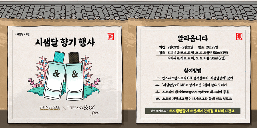 2월 9일부터 21일까지 인스타그램 스토리GIF 검색창에 ‘시샘달향기’, ‘신세계면세점’ 또는 ‘티파니앤코’ 를 검색한 후, 스티커를 활용해 ‘향기로운 2월의 찰나’에 대한 영상 또는 이미지를 꾸며 참가자 계정의 스토리와 피드에 #시샘달향기 #신세계면세점 #티파니앤코 해시태그를 달아 업로드하는 방식으로, 누구나 쉽게 참여할 수 있다.