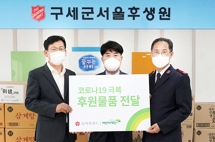 지난달 30일 서울 서대문구 천연동 구세군 서울후생원에서는 신세계푸드 김석봉 CSR담당 상무, 초록우산어린이재단 이형진 본부장, 서울후생원 김호균 원장 등 관계자들이 참석한 가운데 손소독제, 비누 등 코로나19 예방을 위한 위생키트 300세트와 올반 삼계탕, 소불고기, 핫도그 등으로 구성된 가정간편식 150세트의 전달식이 열렸다. 특히 위생키트에 포함된 손소독제와 비누는 신세계푸드 임직원들이 재택봉사를 통해 직접 만든 것으로 의미를 더했다.