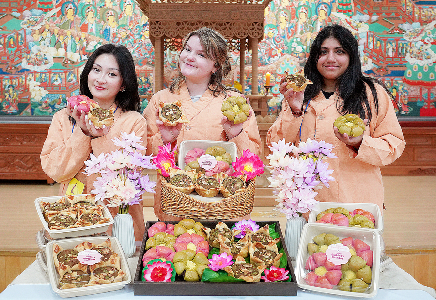 11일 서울 강남구 봉은사에서 템플스테이에 참가한 외국인들이 신세계푸드가 부처님오신날을 맞아 출시한 ‘연잎찰파이’와 ‘연꽃단팥빵’ 등 사찰식 베이커리를 소개하고 있다.