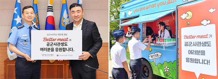 신세계푸드가 해외 훈련을 앞두고 있는 공군사관학교에 대안육 ‘베러미트(Better Meat)’와 이를 활용한 메뉴를 전달했다.