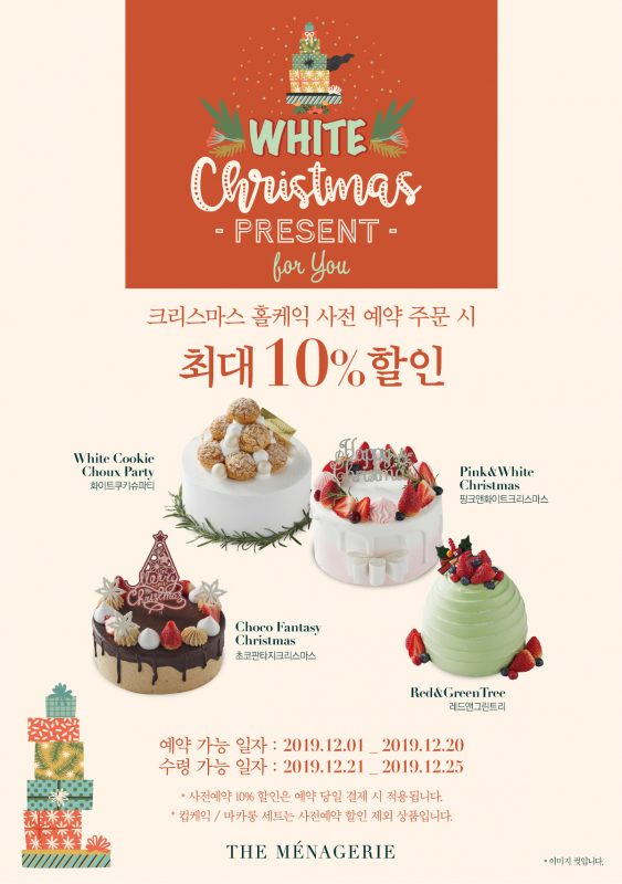 더 메나쥬리에서는 케이크 출시와 함께 사전 예약 할인 행사를 진행한다. 12월 20일까지 크리스마스 케이크를 예약 주문시 10% 할인혜택을 제공한다.(컵 케이크 제외) 사전 주문한 케이크는 12월 21~25일 매장에서 수령이 가능하다.