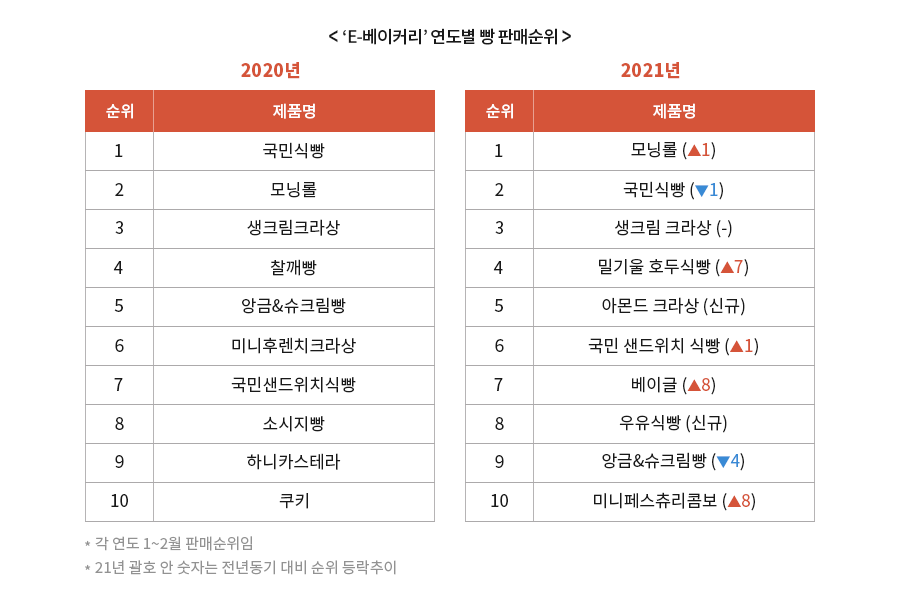 2일 신세계푸드에 따르면 이마트 내에서 운영하고 있는 베이커리 매장 ‘E-베이커리’의 1~2월 모닝롤, 식빵, 크라상, 베이글 등 식사대용 빵류 판매량은 전년 동기 대비 35% 증가한 것으로 나타났다. 특히 ‘E-베이커리’의 전체 판매제품 30여종 가운데 지난해 1~2월 판매순위 2위였던 모닝롤의 올해 판매량은 31% 증가하면서 1위로 올라섰고, ‘국민식빵’(2위), ‘생크림 크라상’(3위), ‘밀기울 호두식빵’(4위), ‘아몬드 크라상’(5위), ‘국민샌드위치식빵’(6위), ‘베이글’(7위) 등 식사대용 빵류가 상위권을 휩쓸었다. 또한 반면 지난해 상위권에 올랐던 찰깨빵, 앙금슈크림빵, 소시지빵 등 디저트 및 간식용 빵류의 판매 순위는 하락했다.