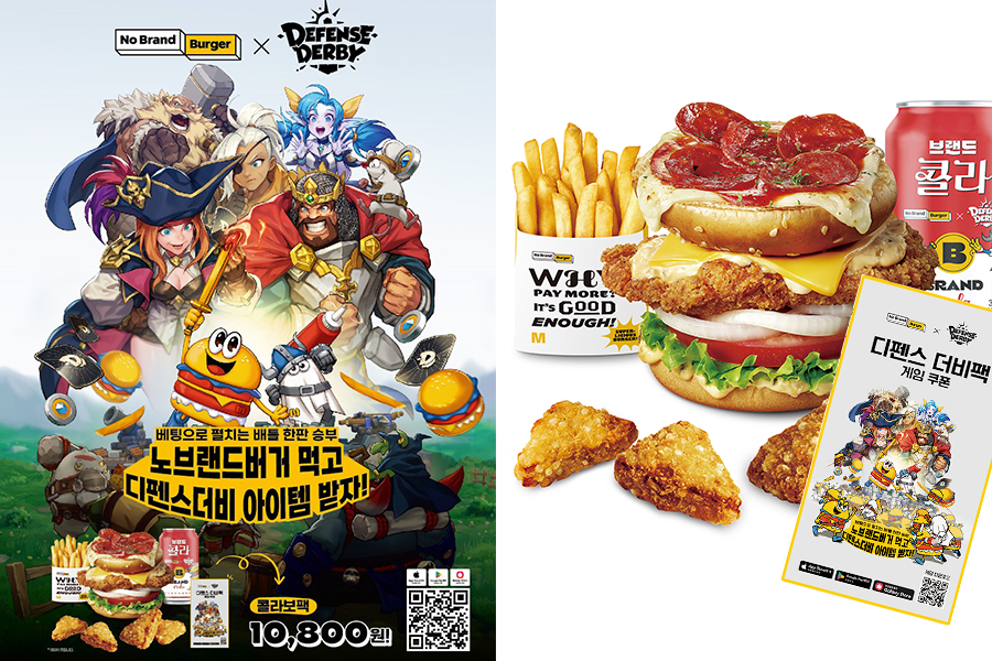 노브랜드 버거의 ‘디펜스 더비팩’은 지난달 출시 이후 인기를 끌고 있는 이색 메뉴 ‘페퍼로니피자 치킨’을 비롯해 ‘감자튀김’, ‘크런치 오징어(4조각)’, 음료 등으로 구성됐다. 특히 기본 음료로 제공되는 ‘브랜드 콜라’에는 디펜스 더비의 게임 속 캐릭터와 노브랜드 버거 자체 캐릭터 ‘버거버거’와 ‘싸개’를 접목한 디자인을 적용해 보는 재미를 더했다. 또한 ‘디펜스 더비팩’에는 노브랜드 버거 테마의 캐슬 스킨, 희귀 카드 1종 및 골드와 엘릭서 세트, 보석 200개 및 골드와 엘릭서 세트 등 다양한 아이템 중 하나를 획득할 수 있는 게임 쿠폰도 포함 되어있다. 가격은 1만800원이다.