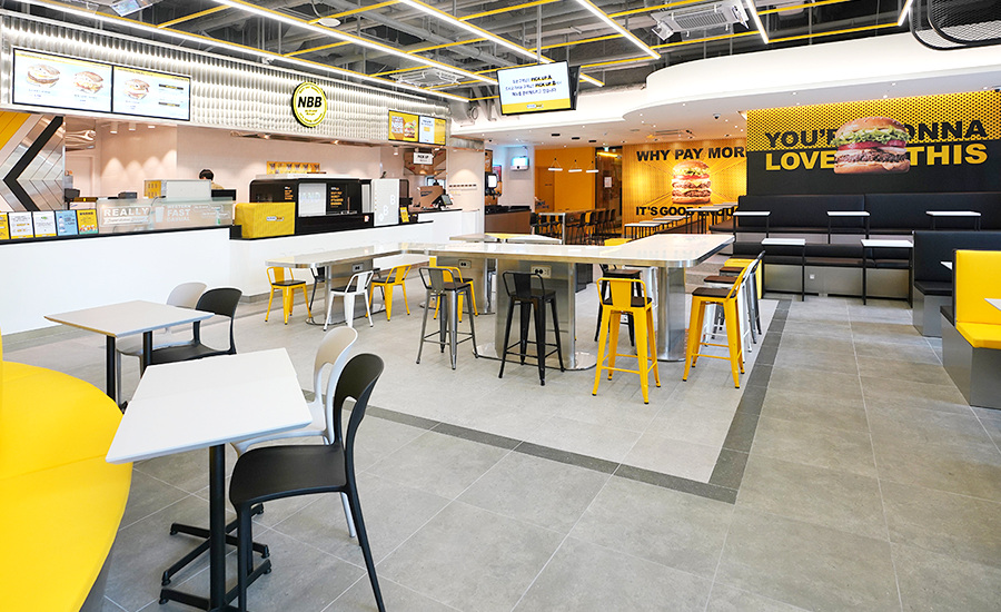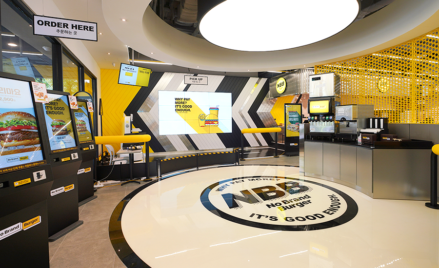 인테리어에 있어서도 매장 내, 외부에 노브랜드 버거의 메인 컬러인 노란색, 흰색, 검은색을 바탕으로 감각적인 일러스트와 이미지 등을 한층 강화해 주 고객인 2030세대가 캐주얼하고 트렌디한 분위기에서 음식을 즐길 수 있도록 했다.