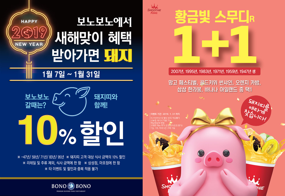 건강음료 브랜드 ‘스무디킹’도 이달 말까지 돼지띠 고객이 ‘망고 페스티벌’, ‘골드키위 썬샤인’, ‘오렌지 카밤’, ‘삼삼 한라봉’, ‘바나나 아일랜드’ 등 황금색 스무디 5종 가운데 1종을 구매하면 같은 종류의 스무디 한 잔을 추가 제공한다.