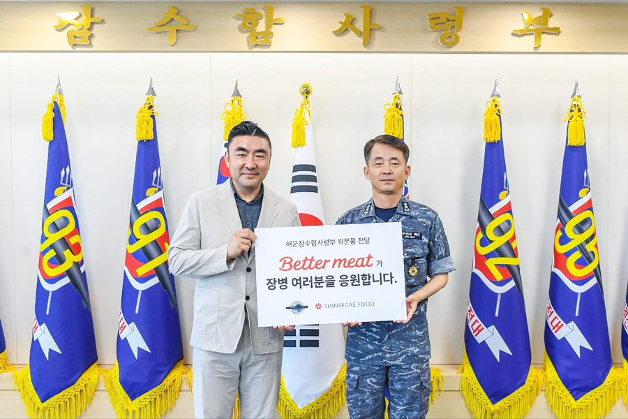 신세계푸드는 지난 14일 경남 창원시 진해구에 위치한 해군 잠수함사령부를 방문해 대안육 ‘베러미트’ 식물성 런천 캔햄 4000개와 ‘베러미트’를 활용해 만든 핫도그, 만두, 토마토 소스 등의 식재료를 전달했다고 밝혔다. 해군 잠수함사령부는 국가 전략무기체계인 잠수함의 작전, 교육 훈련 등을 수행하며 해양주권을 지키는 국가전략부대이다.