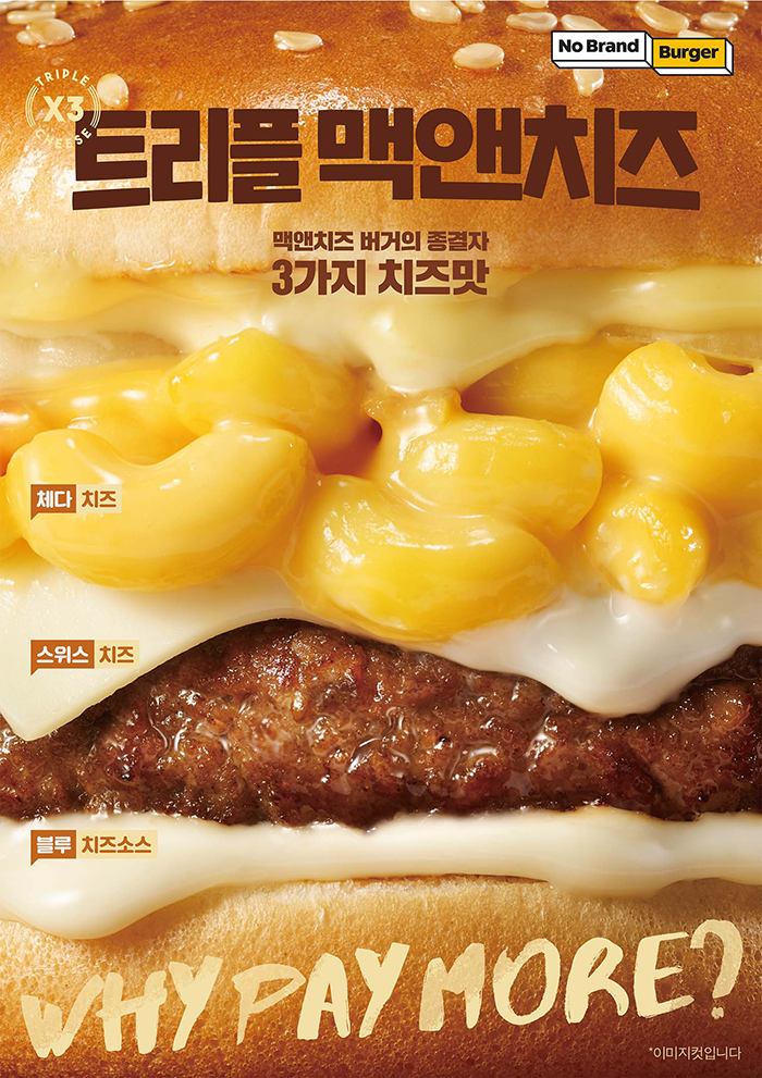 노브랜드 버거의 ‘트리플 맥앤치즈’는 11일부터 노브랜드 버거 매장(일부점 제외)에서 판매하며 가격은 단품 5000원, 세트 6800원이다.