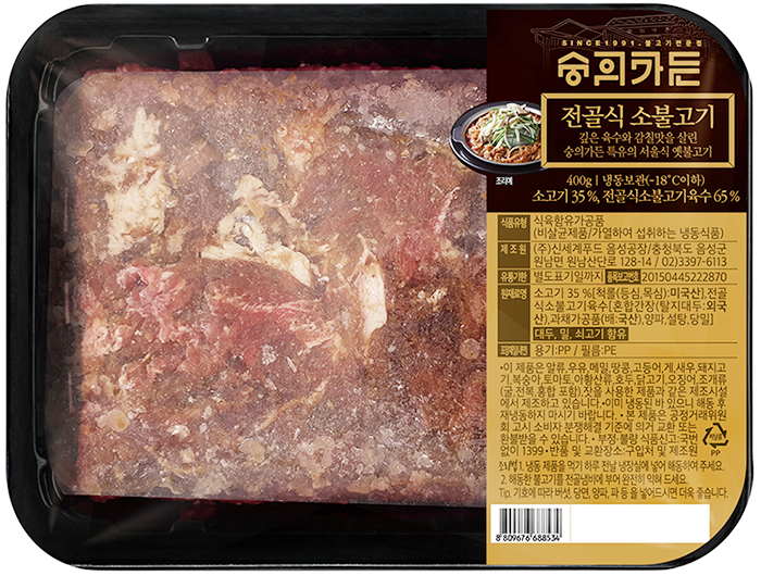이번에 신세계푸드와 숭의가든의 협업으로 선보이는 전골식 소불고기 간편식은 숭의가든의 노하우를 담은 특제양념에 자극적이지 않고 담백하면서도 깊은 맛의 육수를 더한 전골타입 서울식 옛불고기다. 특히 미국산 소고기 중에서도 상위 등급에 속하는 ‘초이스’ 등급의 척롤을 0.8mm로 얇게 썰어 사용해 육질은 부드럽고, 달큰한 특제양념이 잘 베어 숭의가든 특유의 감칠 맛을 살린 것이 특징이다.