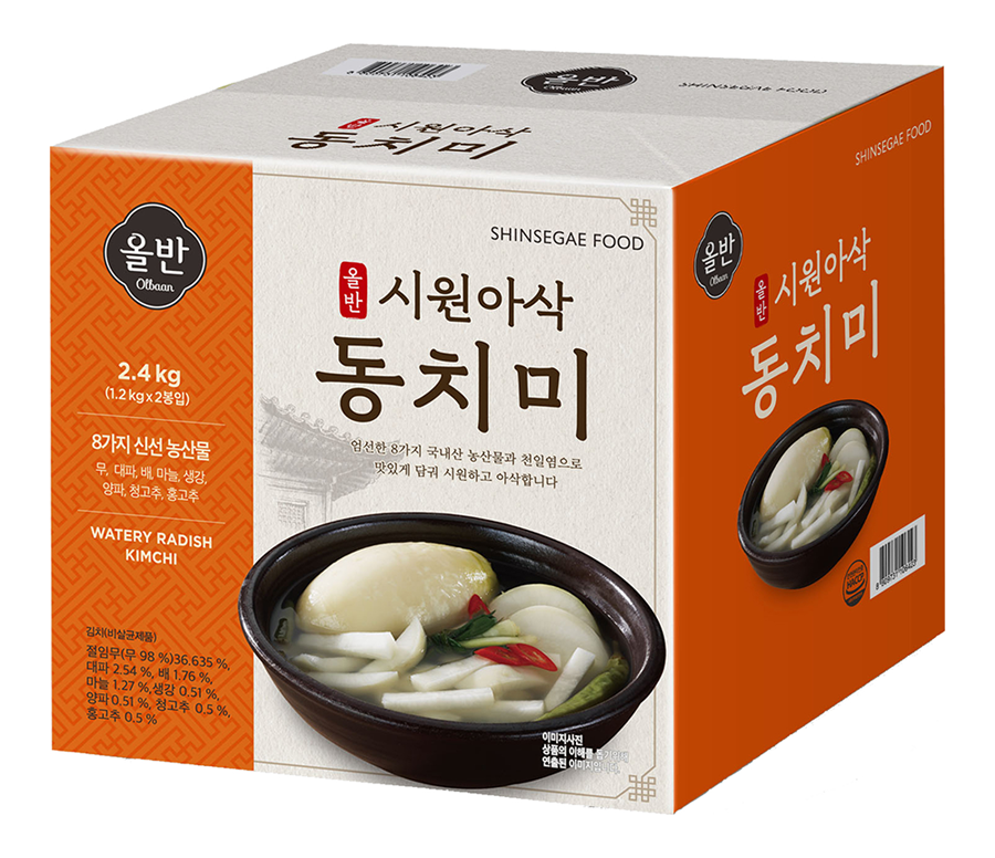 신세계푸드의 ‘올반 시원아삭 동치미’는 신선한 국내산 무를 먹기 좋은 한입 크기로 자른 후 미네랄이 풍부한 천일염과 김치 유산균 ‘류코녹스톡’을 넣고 담가 동치미 특유의 아삭하고 청량한 맛을 오랫동안 느낄 수 있는 제품이다. 또한 국내산 배, 마늘, 생강, 양파, 청고추, 홍고추 등 신선 농산물을 풍부하게 사용해 시원하고 깔끔한 동치미 육수의 맛을 구현해냈다. 특히 1.2kg 소포장 2개를 1세트로 구성해 보관의 편의성을 더한 것이 장점이다.