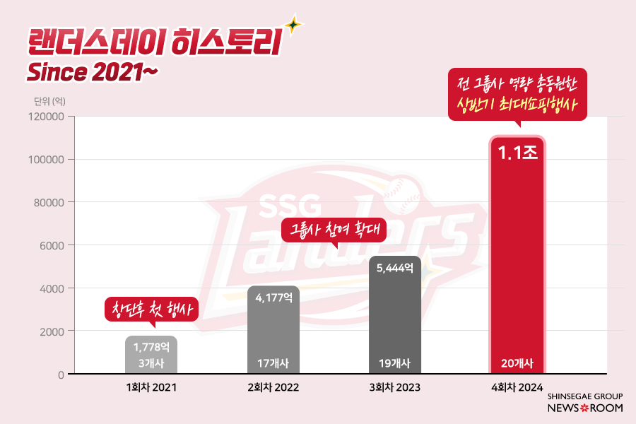 SSG랜더스 창단 첫해인 2021년 시작된 ‘랜더스데이’는 신세계그룹 그룹사가 참여하는 대규모 할인 행사다. 3개사(이마트, SSG닷컴, 이마트24)의 참여로 출발한 랜더스데이는, 매해 참여 그룹사를 확대하며 규모를 키워나갔다. 그리고 어느덧 쓱데이를 잇는 대한민국 대표 쇼핑축제로 자리매김했다.