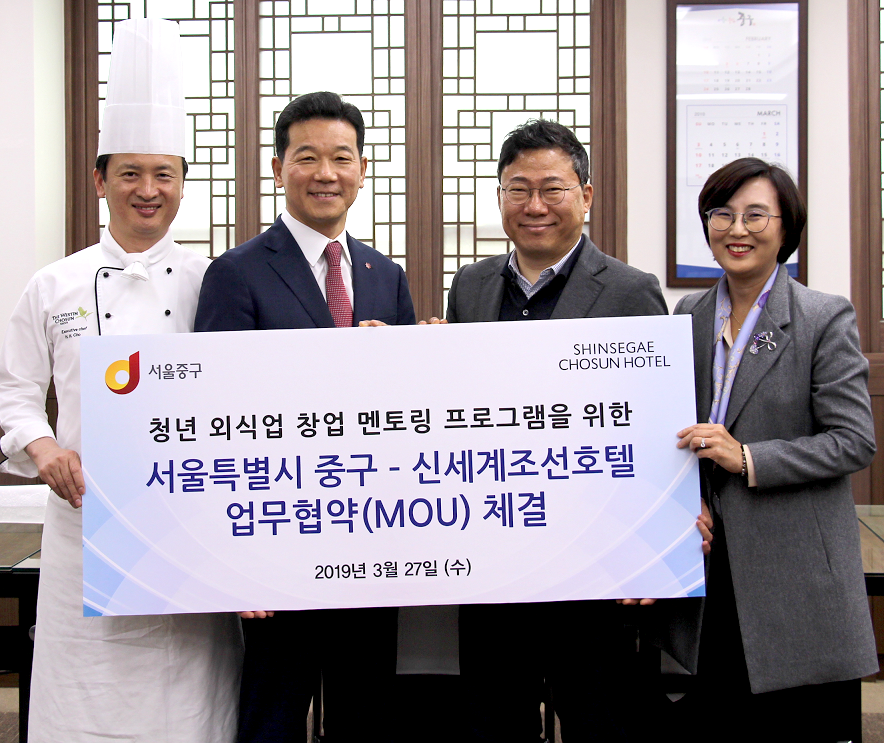 신세계조선호텔(대표이사 이용호)이 3월 27일 오전 11시 서울 중구청에서 서울 중구청(구청장 서양호)과 함께 청년 외식업 창업 멘토링 프로그램을 위한 업무 협약을 체결했다.