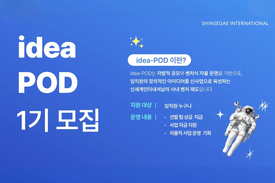 신세계인터내셔날은 2월 23일까지 임직원을 대상으로 사내벤처 프로그램 ‘아이디어 팟(idea POD)’ 1기 참여자를 모집한다고 11일 밝혔다.