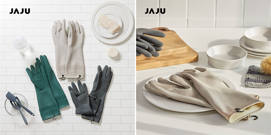 자주(JAJU)는 그레이 고무장갑의 반응이 좋자 다크 그린, 라이트 베이지로 색상을 다양화했으며, 기능성에도 집중했다. 단단한 밴딩 처리를 통해 착용 시 흘러내림이나 내부에 물 튐이 없도록 하고 끝에 고리를 부착해 사용 후 건조와 보관이 편리하도록 했다.