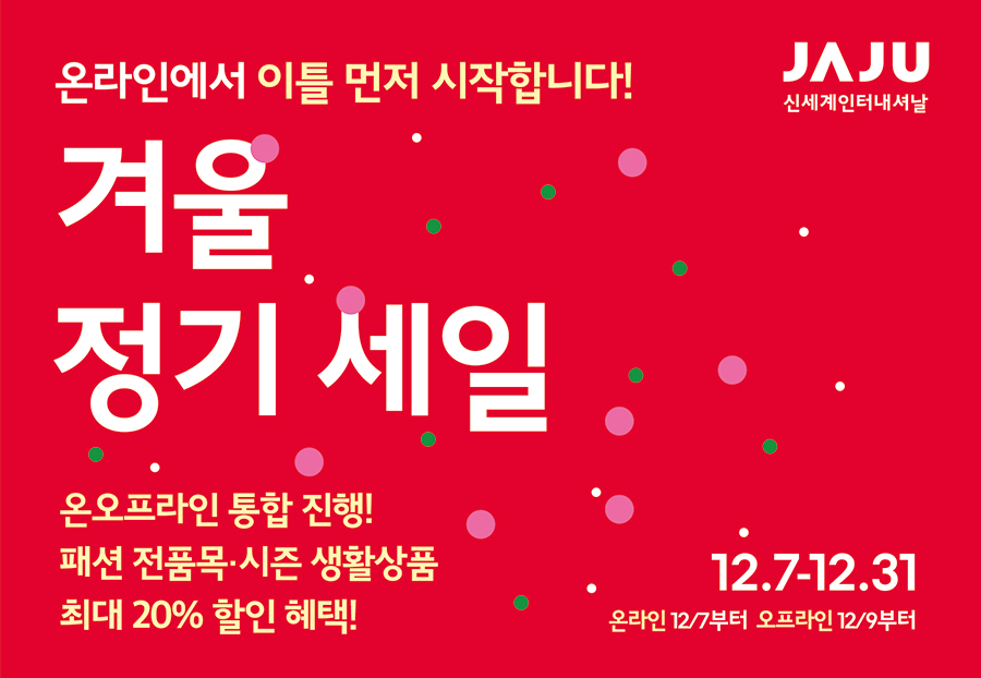 신세계인터내셔날의 라이프스타일브랜드 자주(JAJU)가 올해 마지막 정기 세일에 돌입한다. 온라인몰 에스아이빌리지(S.I.VILLAGE)는 7일부터, 전국 오프라인 매장은 9일부터 연말까지 패션 전품목과 시즌 생활상품에 대해 최대 20% 할인 판매한다.