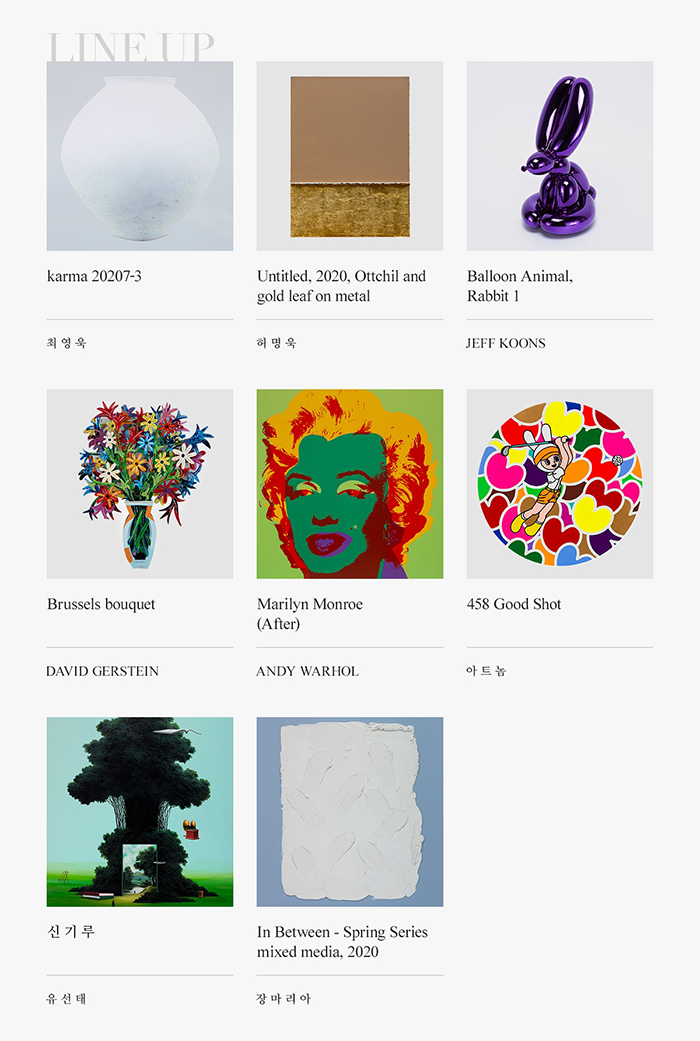 제프쿤스의 벌룬 애니멀, 데이비드 걸스타인의 원작 그림과 아트 소품, 물방울 그림으로 세계적 명성을 얻은 김창열 작가의 원작 그림, 최영욱 작가의 달항아리 원작 그림 등을 구입할 수 있다. 미술품 가격은 10만원대부터 6천만원까지 다양하다.