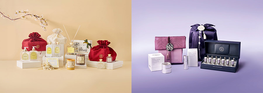 800년 전통 이탈리아 뷰티 브랜드 산타마리아노벨라(SANTA MARIA NOVELLA)는 오드 코롱 향수와 바디듀오 세트 등 구매 시 행운을 담은 로쏘(레드) 컬러와 순백의 미를 담은 비앙코(화이트) 보자기를 사용한 기프팅 서비스를 제공한다. 스위스 명품 스킨케어 브랜드 스위스퍼펙션(SWISS PERFECTION)은 브랜드의 대표 앰플 3종 및 70만원 이상 구매 고객에게 고급 오간자 파우치와 노리개로 장식된 명절 프리미엄 기프팅 서비스를 제공한다.