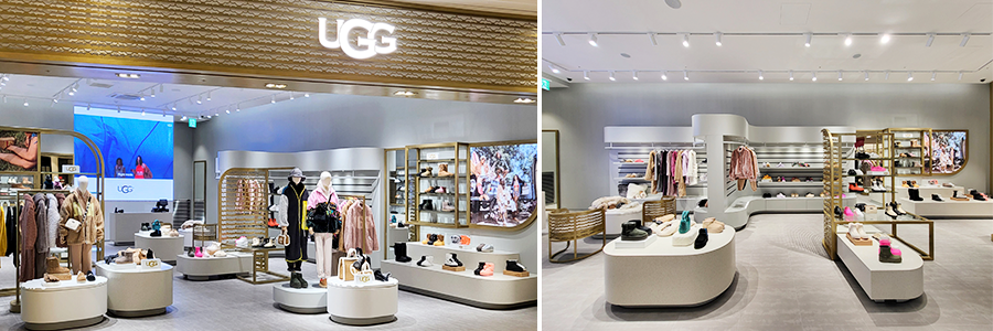 매장 인테리어는 전체적으로 뉴트럴 톤을 활용해 어그 특유의 편안하고 따뜻한 분위기를 연출했으며, 골드 색상의 철제 소재 집기를 곳곳에 배치해 심플하면서도 고급스러운 공간으로 구성했다.