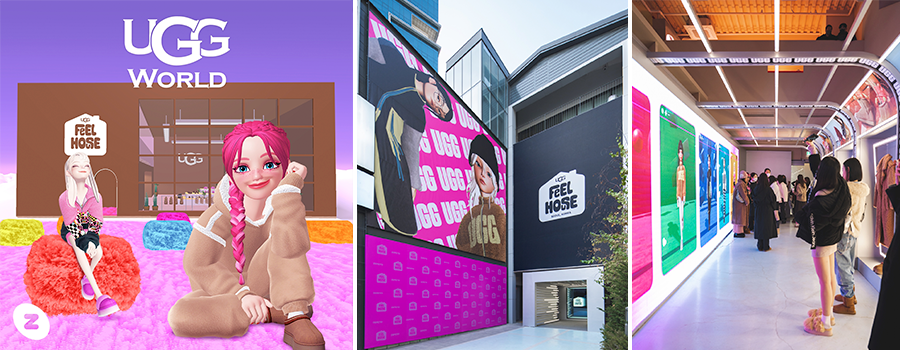 어그는 제페토 안에서 운영하던 ‘어그 월드’를 현실 세계 팝업스토어로 구현했는데 고객들이 전시된 옷을 입고 스크린 앞에 서면 동일한 옷을 입은 아바타가 등장해 함께 사진을 찍을 수 있었다. 또한 매장 곳곳에 숨겨진 QR코드를 스캔하면 제페토 내 가상 세계인 ‘어그 월드(UGG WORLD)’를 바로 방문할 수 있게 하면서 브랜드 경험과 매출이라는 두 마리 토끼를 잡는데 성공했다.