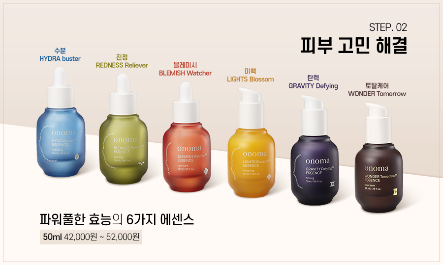 메인이 바로 2단계인 에센스다. 다양한 피부 고민에 맞춰 수분, 진정, 스팟케어, 미백, 탄력, 토탈케어까지 6가지 에센스를 준비했다. 오노마의 특장점은 각기 다른 피부 고민을 가진 사람을 대상으로 철저히 연구한 브랜드라는 점이다. 더불어, 전 품목 인체적용실험을 통해 효능을 검증하였다.