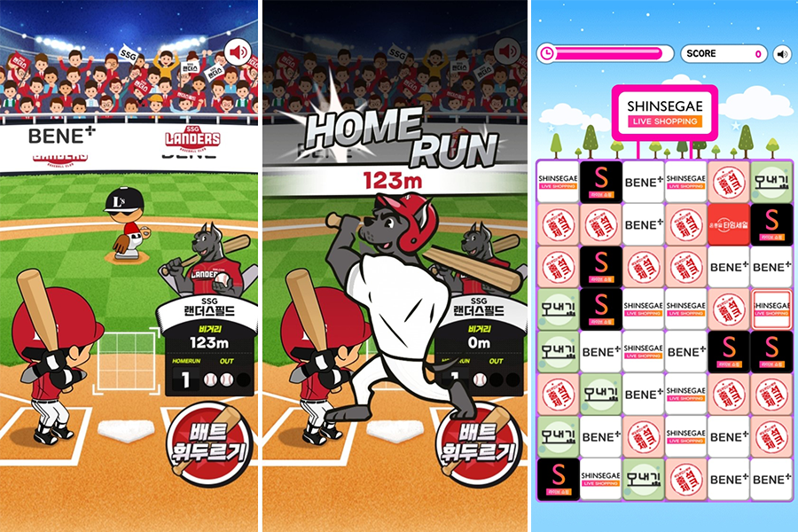 현재 신세계라이브쇼핑 앱에 들어오면 타이밍을 맞춰 공을 타격하는 ‘랜더스 홈런더비’와 장애물을 피하는 ‘달려팡’, 블록을 매칭해서 터뜨리는 ‘맞춰팡’, 과녁에 화살을 겹치지 않게 계속 쏘는 ‘쏴라팡’ 등의 게임을 할 수 있다. 1~2개월마다 새로운 게임을 서비스하면서 인기 있는 게임들만 계속 남겨두는 형태다.
