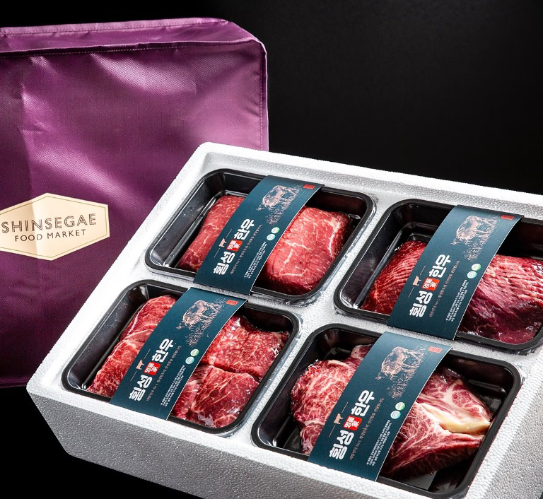 대표 상품으로 신세계백화점 협력업체 ‘횡성명품가한우’의 ‘횡성한우1+등급 한우 로스구이세트 7호(1.6kg, 33만원대)’가 있다. 포장까지 신세계백화점의 품격을 담은 보냉가방에 담아 산지 직송으로 신선하게 받아볼 수 있다.